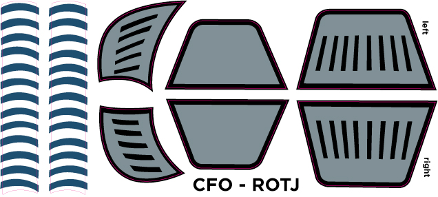 “CFO – ROTJ” HELMET DECALS These accurate decals were painstakingly created using screen shots and high resolution photo’s of the actual “ROTJ” helmet worn SW- ROTJ. Will fit CFO ONLY. If you are hoping to find a symmetrical set of decals for your ROTJ helmet, these are NOT it.